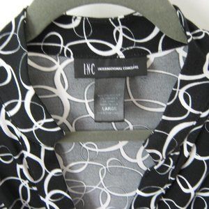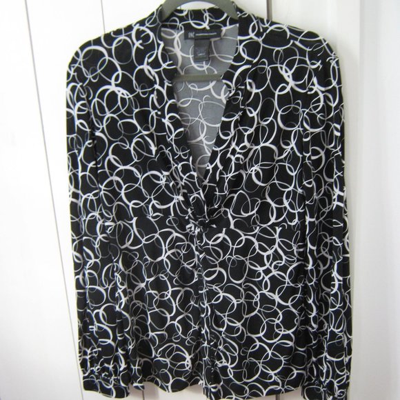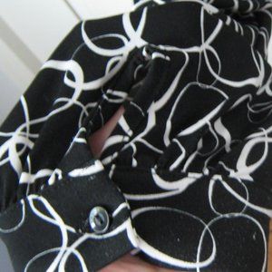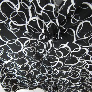 Poly blend fabric with great stretch. Black background with offwhite ring pattern.