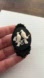 The black and white love birds cameo, crafted from hard resin, is beautifully set on a black bezel base with intricate antique-style detailing.