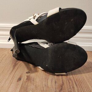 Very good used condition black and white high heels in size 8.5. Black mesh accents with gold buckle details. Heels are about 4", see last photo! Worn just a handful of times.
