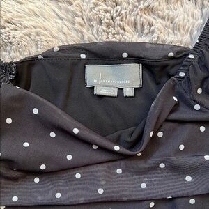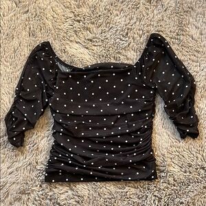 This elegant blouse features a striking black and white polka dot pattern, complemented by puff sleeves that add a touch of romance. The fitted design with ruched detailing ensures a flattering silhouette, making it a versatile choice for both casual and formal occasions.