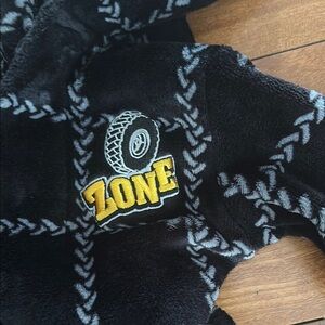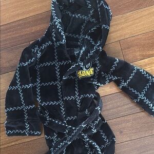 Experience ultimate comfort with this plush black and white robe, featuring a cozy shawl collar and a secure belt for a snug fit. The soft fabric ensures a warm and relaxing feel, perfect for lounging or a restful night's sleep.