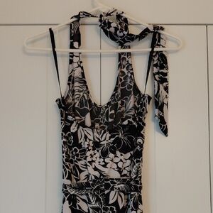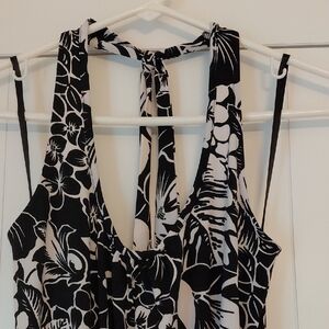 This striking black and white maxi dress features a sleeveless halter neckline and a bodycon style, perfect for casual or resort wear. The bold print and elegant silhouette make it a standout piece for any summer occasion.