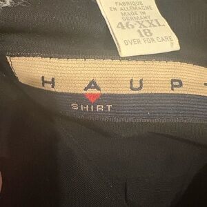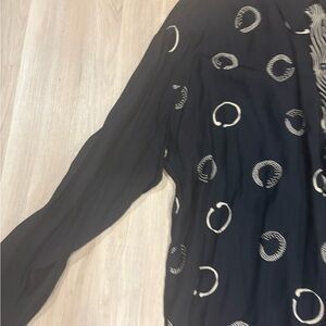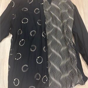 This dress shirt features a striking split design with one half showcasing a black base adorned with light-colored circles, while the other half presents a modern geometric pattern. The long sleeves and collar add a touch of sophistication, making it a standout piece for any formal occasion happy handcrafted from Germany xxl