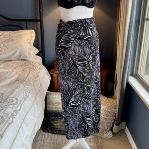 Black and white zebra palm leaf print bathing suit cover up with gold claw clasps at two ends. In excellent like new condition, no identifying tags, feels like a synthetic stretchy material. Can be worn multiple ways. Measures 40.5 inches by 52 inches. Cat friendly, nonsmoking home.