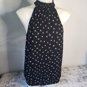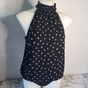 High neck that has a ruffled stretch. The waist is also ruffle stretch so can be
