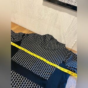 Chic and modern long-sleeve tunic by DINH BA featuring a black and grey dotted pattern with solid black side panels for a flattering silhouette. Soft, stretchy and comfortable material. Gently flared cut with a stylish cowl neck. No fabric tag visible. Size indicated: XL.