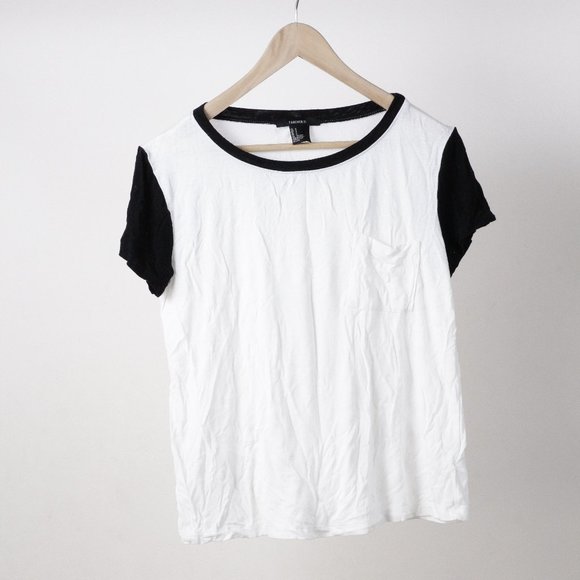 Black and white loose-fitting baseball style tee. Shirt is a size small but because of the nature of the material it fits closer to a medium. Item is still in very good condition. Perfect to pair with jeans or shorts.