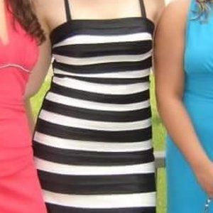 Size 10 JS Collections evening dress. White and black stripes. 80% polyester, 20% spandex. Lining is 100% polyester. Worn twice. In good condition.