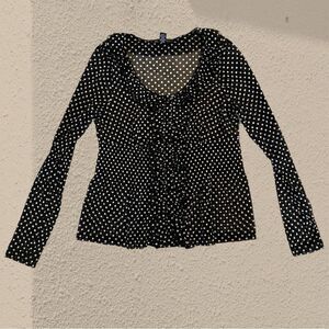 Adorable mesh blouse from INC. black and white polka dot mesh blouse. Fitted style with ruffled collar and ruffles down the front, tiny little buttons down the front as well. The waist is ruched, super flattering. Size large. True to size. Excellent condition.