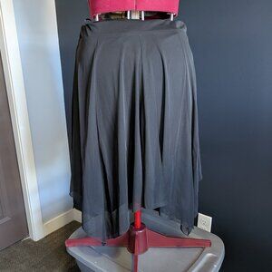 Black asymmetrical hemline midi skirt, elastic waist, full lined with sheer overlay. Worn very lightly.