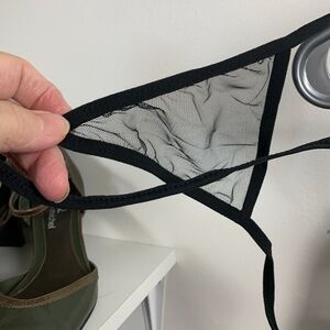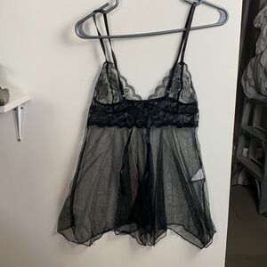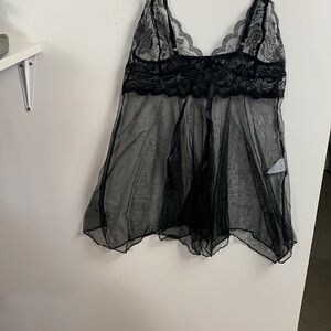 Sexy, black baby doll with matching thong. Adjustable straps on both pieces. Asymmetrical hemline.