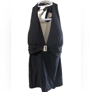Elegant bathing suit top featuring a stylish belt detail. Perfect for any occasion. Just the top.