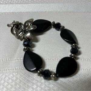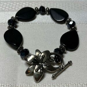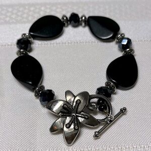 This bracelet features a stunning combination of black and silver tones, highlighted by a beautiful floral clasp closure. Perfect for adding a touch of interest to any outfit.
