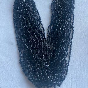 Multiple strands of shiny black beads with white hand-macramed closure. 16"