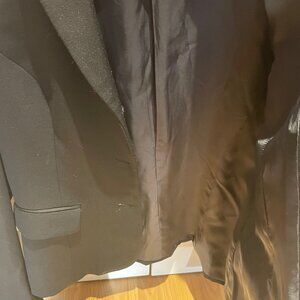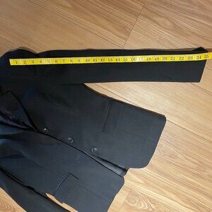 Really nice quality, basic black women's blazer / suit jacket. Has three buttons, pockets, lined, collar, padded shoulders. A great wardrobe staple.