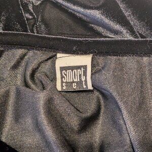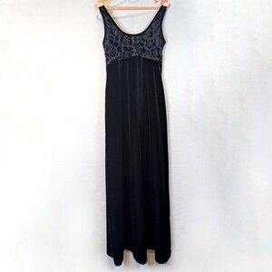 A simple yet elegant design. The top has the burned-out velvet, the bottom is plain, joined in a flattering curve. No size tag so please check measurements.
