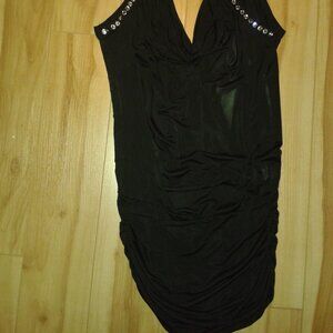 Sexy dress with a stone-set neckline, draped cut-out at the front, plunging and draped racerback. Above the knee length. Pleated on the sides of the skirt. Brand : Day & Night. 95% rayon/5% lycra. Color : Black. Size : Small.