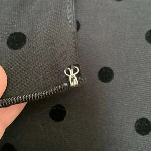 Pretty a-line dress with 3/4 sleeves. Back zipper and eye hook. Nice structure and fabric with stretch. Black with small black felt Polk dots. Immaculate condition. Size XXL