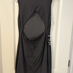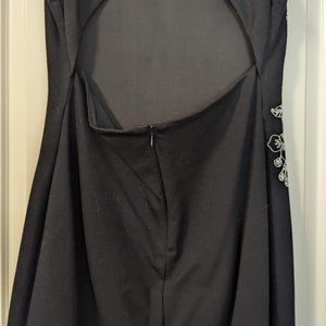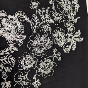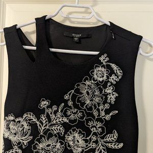 Guess brand black mid-length dress, size Large. White floral embroidery, cut out in back (does not expose bra), small cut out on one shoulder.