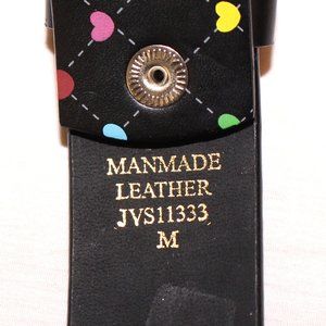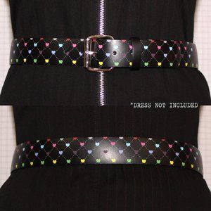 Black faux leather belt featuring small multicolored hearts all over. Buckle can be taken off, to fit a plate buckle instead. Has five holes. Never worn. Belt is 40" long and 1½" wide. Can be buckled up from 32" to 36". Comes from a smoke-free home that has cats and dogs. Tags: punk, y2k, alternative