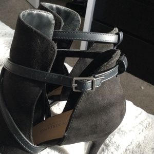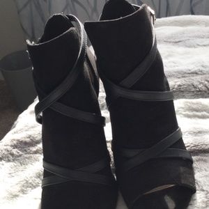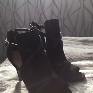 Black faux suede heels, open toe, side cutout, ankle strap closure, cross strap leather details, size 8, very good condition, heel height is 4 inches