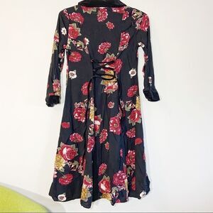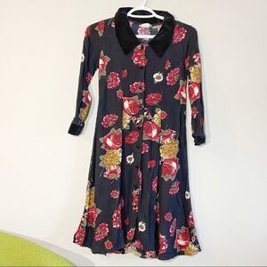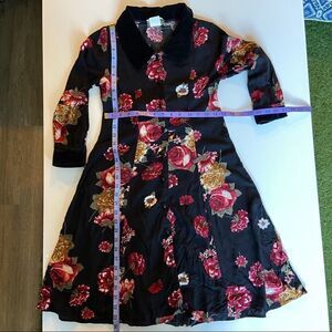 Black floral velvet collar mini dress, tie back waist women’s petite XXsmall -petite or kids large perhaps refer to measurements. Very cute tiny button down vintage dress. Great vintage condition.