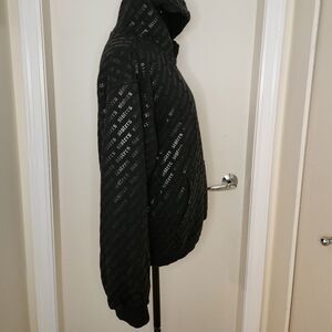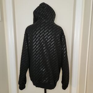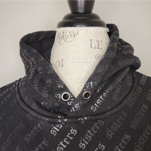 Shiny black on black monogrammed graphic printed "Sisters" hoodie sweatshirt with kangaroo pouch front, by James Charles' line, SISTERS.