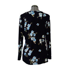 Black jersey knit top, flowered pattern, Lily Morgan, Extra Large, Side ruching.