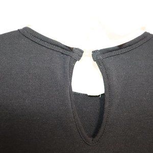 Cute, lightweight black jersey shift dress with sewn in white collar and white cuffs. The easy flowing jersey material makes it great to hide imperfections, and it's flattering of curves, especially if you add a belt. Necklace in the picture isn't included. I'm 5'4 and the hem sits just below my knees.