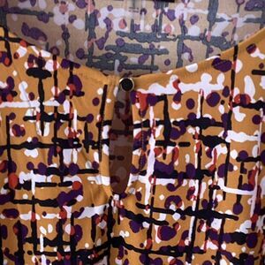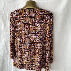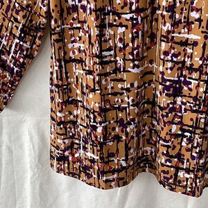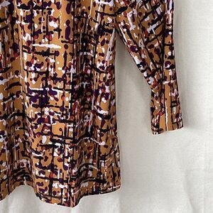 Polyester elastaine, abstract design, round neck with button detail, 3/4 length sleeve, yellow, red, navy, EUC, neck to hem 25”, armpit to armpit 21”, armpit to cuff 13”