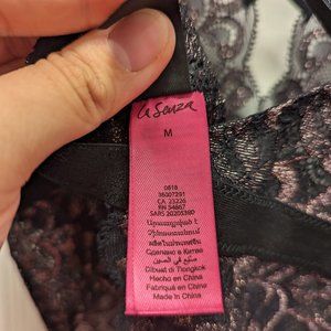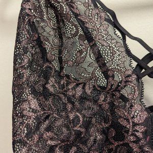 Description: Unlined lace bodysuit in black and pink shimmer lace. Bumless (open bottom) with double adjustable shoulder straps.