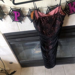 Fabulous 1990s Betsey Johnson pink dress with black lace overlay & large floral embroidery. This piece is TOO GOOD. Ruched sheath/wiggle dress with black lace & the most gorgeous embroidery. Adjustable spaghetti straps, small amount of stretch. Labeled size “P”.