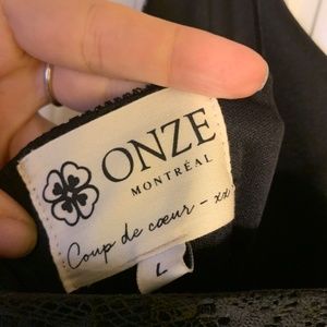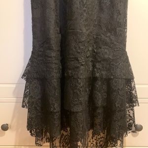 Black lace strappy dress with ruffle at bottom. Midi length. Never worn. The material has stretch. Polyester.