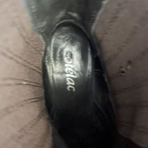 Black leather Chelsea boots made in Portugal for Cotelac Paris. European size 38. Genluine leather, inside and out, with elasticized leather openings and pull tabs for ease of entry. Non-slip Cotelac heel and sole. 2 inch bevelled heel, rounded toe.