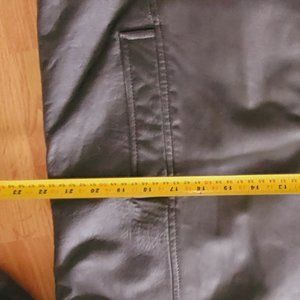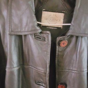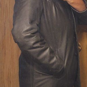 Woman straight cut solid black lined leather Jacket. Flattering, nice on someone tall. Great shape. 3 buttons at front, 2 pockets. Soft leather. 29.inches long, 22 wide. Size L/Xl, 12 to 14.