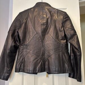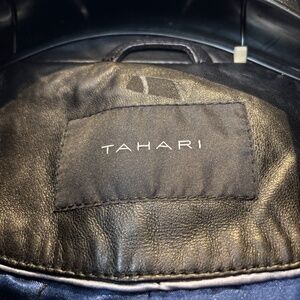 Black leather jacket by Tahari, fitted at waist with stitching detail, funnel neck, silver-tone metal front zip. Size XS, excellent condition. Dark blue silk lining.