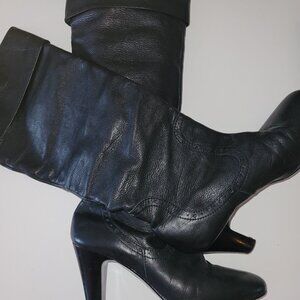 Made in Italy; Unique pirate-style tall leather boots with a flipped cuff slouchy design; black pebble-pressed leather, heel 3"; shaft approximately 14" from the top of foot to edge, boot opening measure 14" all around; decorative perforations on top, no zipper, no buckles, just sliding in, solid look and very slim looking;