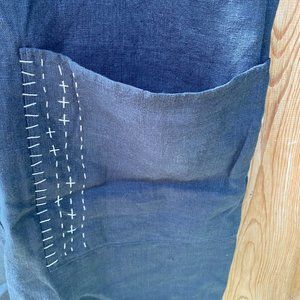 Black linen, cut straight (not a-line), size medium, 20" bust, 20" waist and hips, 34" long. Lovely sashiko stitching on one of the two big patch pockets. (Apologies for the creases from folding, I don't have an iron). Never worn.