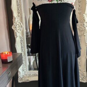 This Venus off-the-shoulder dress in size small is a chic and elegant black dress with a flattering silhouette. It features: