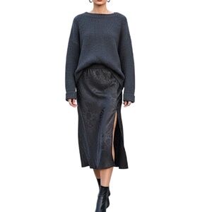 Black old money minimalist floral damask silky satin bias cut midi slip skirt L
