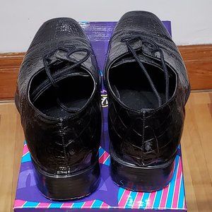 Black vegan patent faux crocodile oxford shoes in a US size 10½. Worn inside twice for a showcase at a convention center.