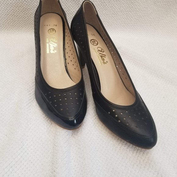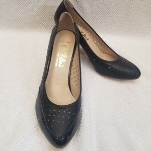 Practical and pretty black leather pumps. The leather is perforated with accents of patent black leather on the toe and the heel of the shoes. 2" low heel, with padded inner sole for comfort and leather/manmade material for the outer sole. Handmade in Italy. New and unworn.