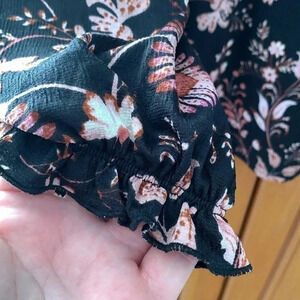 Size 1X with stretch. Cute detail at shoulders and cuffs. Black with pink floral.