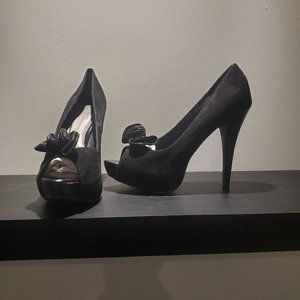 Black seude platform heels with black seude embellishment. Black patent leather over heel. Brand new shoes.