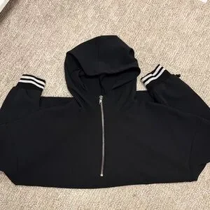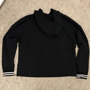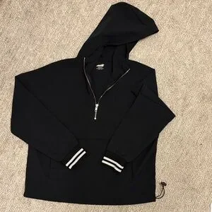 Avia light black pullover. Features a hood, striped cuffs, toggle at the waist, gold zipper and front pouch pocket. Ideal for casual or active wear.