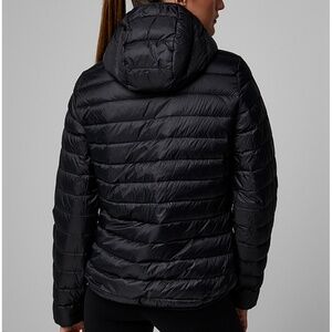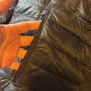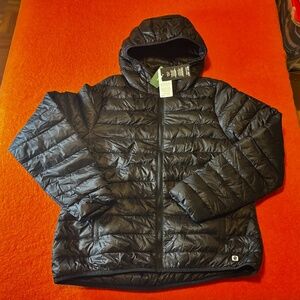 Black responsible down packable hooded puffer jacket new with tags. Trendy eco-designed puffer jacket that is the perfect practical and lightweight, minimalist piece for your outdoor adventures, quilted and waterproof recycled nylon fabric, ultra-light down insulation from farms with certified responsible practices, rugged water-repellent Teflon EcoElite™ finish made from renewable plant-based materials, comfortable tunnel hood, full-length zip, zip-front pockets, packs into its own small travel pouch. Marked size L. All measurements are approximate and taken with the garment laying flat: Armpit to armpit 21" Total length 25" in front and 27’’ on the back. This item comes from a smoke free, pets friendly home. Recycled bags/box used when possible. Please, let me know if you'd like any additional pictures and/or measurements or other info. Thanks for watching!
