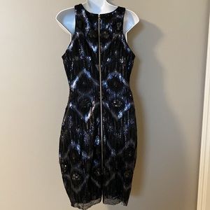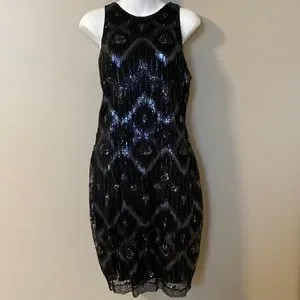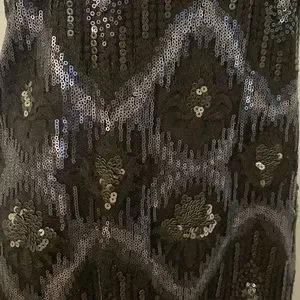 Beautiful black sequin dress. Timeless dress and so well made. Hugs all your curves. Fits like a medium. Wore it once to a wedding. No rips snags or tears or loose sequences.