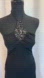 Meet of stretchy spandex material. Ties in the back of the neck in a halter top style. Small amount of ruching in chest area and sides. Light chest padding. High low asymmetrical hemline. Only flaw is one black sequin is loose as pointed out in photo