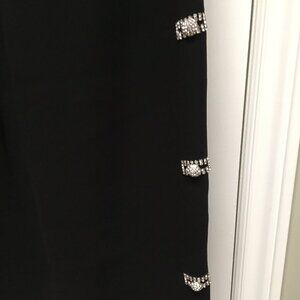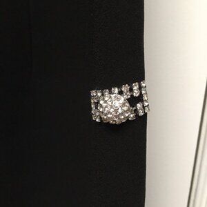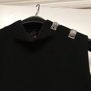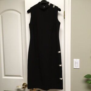 Black sheath dress by Rickie Freeman for TERI JON, in size US4. Sleeveless, mandarin collar, center back zip closure with two self covered buttons. Crystal embellished faux buttons and button holes on left shoulder (2) and left hip (3). Body 71% triacetate, 29% polyester. It's a woven, fairly thick fabric with stretch. Lining is probably polyester or nylon, not indicated. Please note that the dress has been taken in at the chest (it can be undone); see measurements. Chest (flat) 17 1/2 inches, waist (flat) 15 1/5 inches, hips (flat) 19 inches, length 38 inches. Retailed for $395. Worn once, in great condition.