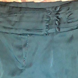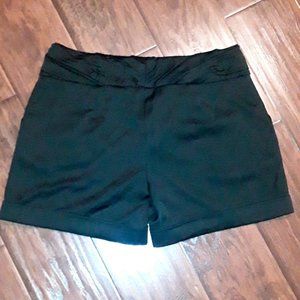 Black silky-feel shorts, high-rise with front pockets and zipper and button closure (not hyper high-rise). Fabric buttons as well as ruched waist band embellishment. Excellent condition. Size M, fits between a size 6-8.